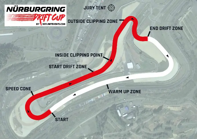 Die Strecke am Nürburgring verlangt den Fahrern alles ab und ist taktisch klug in verschiedene Zonen unterteilt. Unmittelbar nach dem Start vor der Goodyear-Kehre tauchen die Piloten in die Aufwärmzone ein, bevor am "Speed Cone" die volle Beschleunigung zählt, um mit maximalem Tempo in den ersten Drift einzusteigen. Ab dem Start der Driftzone im Michael-Schumacher-S müssen die Boliden quergestellt werden, wobei die Ideallinie exakt an den inneren und äußeren Markierungspunkten entlangführt – den sogenannten "Inside Clipping Points" und "Outside Clipping Zones". Die engsten Duelle werden in der Outside Clipping Zone an der Kurzanbindung erwartet, da sich die Fahrer hier am nächsten kommen. Die Wertung wird erst nach der letzten Kurvenkombination am Ende der Driftzone abgeschlossen. Das erfordert höchste Konzentration bis zum allerletzten Zentimeter Asphalt.